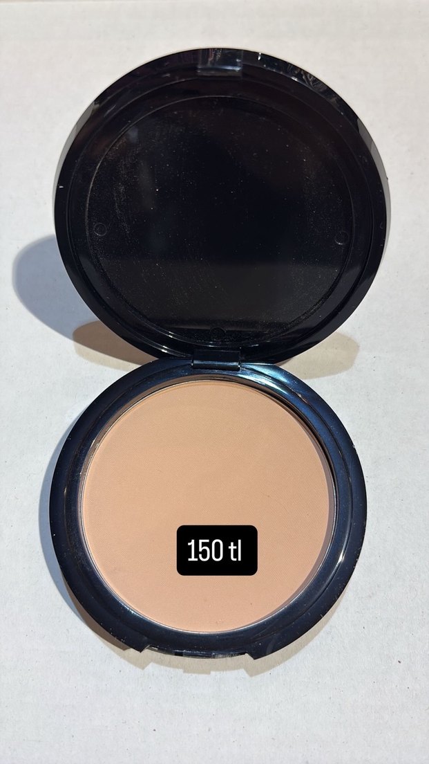 Koyu renk kapaklı kompakt tasarıma sahip bej pudra. Fiyat etiketi 150 TL olarak belirtilmiştir. Cilde pürüzsüz bir görünüm sağlar.
