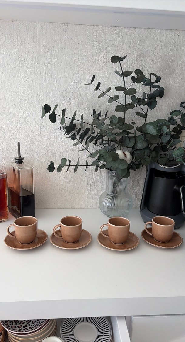 Dört adet koyu bej renkli seramik fincan ve tabaktan oluşan takım. Pürüzsüz yüzeye ve sade şık tasarıma sahiptir. ☕ hiçbir kusuru yoktur ihtiyaç fazlasıdır pazarlık yapılır