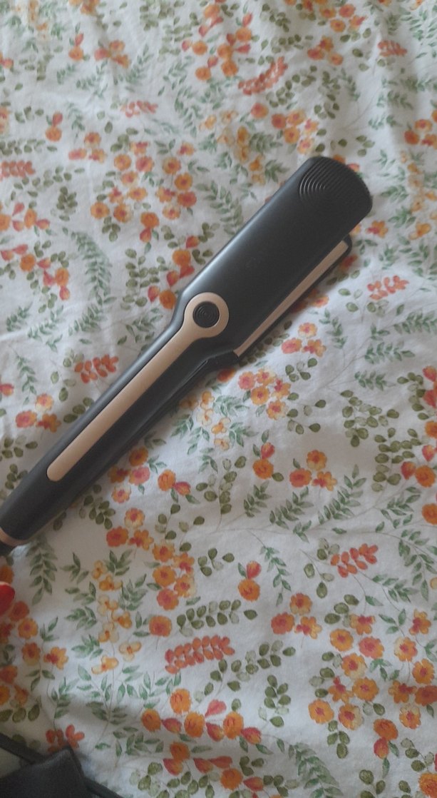 Koyu ve bej renklerden oluşan saç düzleştirici, saçları etkili bir şekilde düzleştiren pürüzsüz tablalara sahiptir. ✨