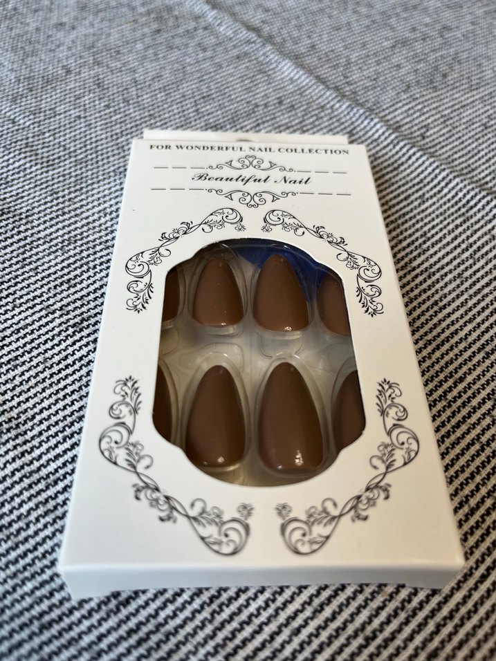 Parlak görünümlü koyu bej tırnak süsleri, tırnaklara kolayca uygulanabilir.24 adet tırnak 23 adet yapıştırıcı bir adet törpü