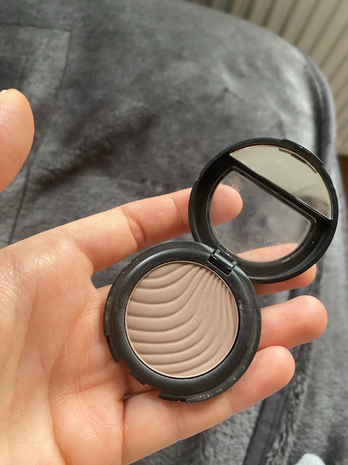 Koyu bej tonunda, dalga desenli yüzeyi olan kompakt makyaj ürünü. İçinde ayna bulunur.