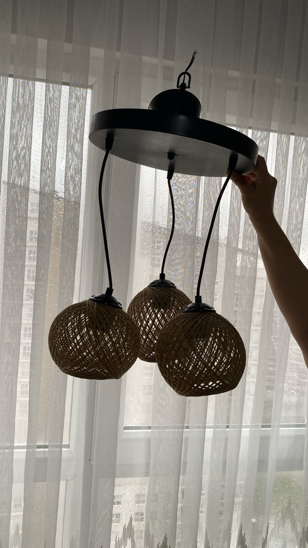 Koyu bej renkte, yuvarlak siyah metal tabana bağlı üç adet hasır örgü avize ile doğal ve sıcak bir aydınlatma sağlar.