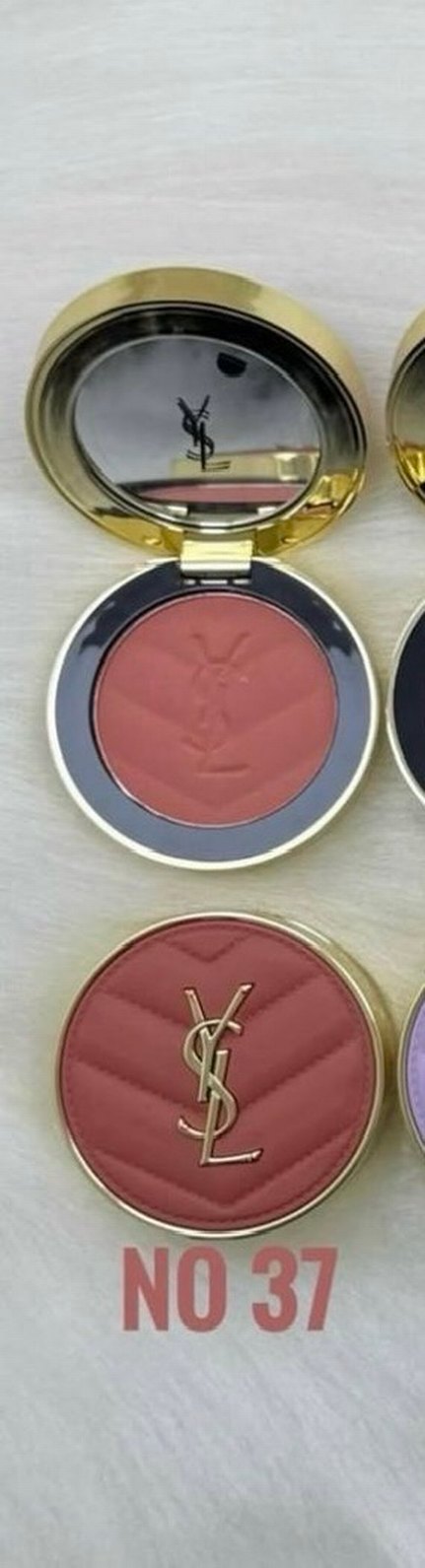 YSL marka koyu bej allık, yuvarlak kompakt kutuda ve kabartmalı logo ile. Yanaklara doğal bir renk katar.