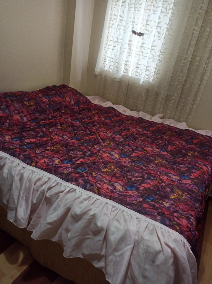 Koyu bordo batik desenli yatak örtüsü, yumuşak kumaşı ve beyaz fırfırlı kenarı ile yatağa farklı bir hava katıyor. ️tek kişilik
