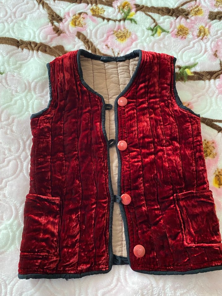 Koyu bordo renkte, düğmeli ve yakası kesik detaylı, bohem tarzda, kumaş kadın yelek. Günlük kullanıma uygundur.