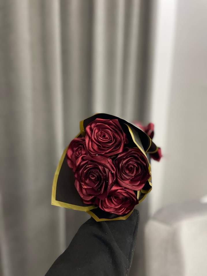 Siyah ve altın renkli kağıda sarılmış koyu bordo güllerden oluşan buket.