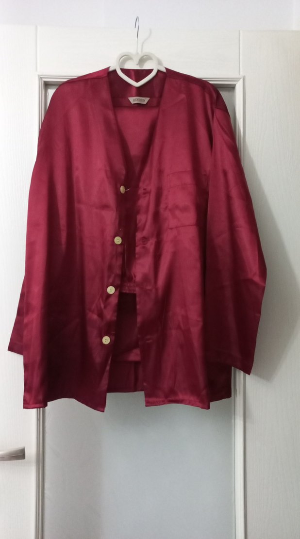 Koyu bordo renkte, uzun kollu, bol kesim midi uzunluğunda kadın sabahlık. Minimalist ve desensiz normcore tarzda.saten kumaş,alt pijamada ufak lekeler var oda durduğu yerde oluştu sanırım hiç kullanılmadı çünkü yikanirsa geçecektir,fiyatı o yüzden uygun tutucam kesinlikle kaçırmayın derim kumaş ve dikimi çok iyi ucuz değil ceyizlik alinmisti zamanında .