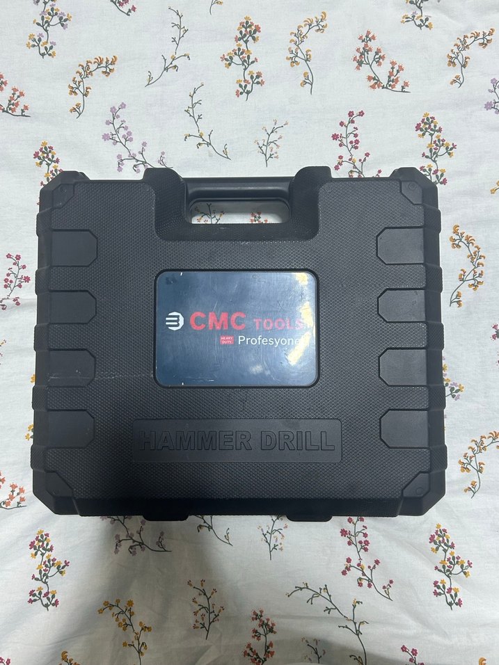 Koyu camel renkli profesyonel matkap kutusu, sağlam tutma sapı ve dayanıklı yapıya sahiptir. CMC Tools markalı ve hammer drill olarak etiketlenmiştir.