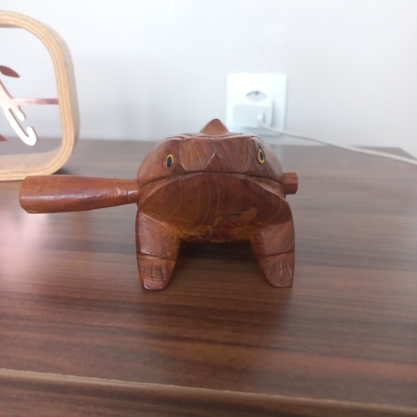 Koyu deve rengi ahşaptan yapılmış, yan tarafında sap bulunan oyma kurbağa figürüdür.