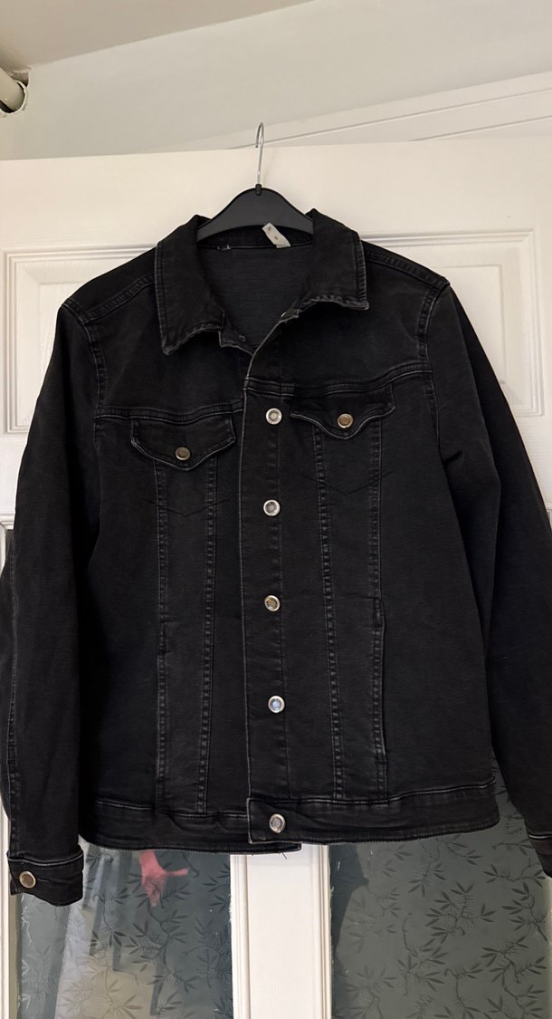 Koyu füme siyaha yakın renkli, düğmeli, normal uzunlukta midi kadın denim ceket. Uzun kollu