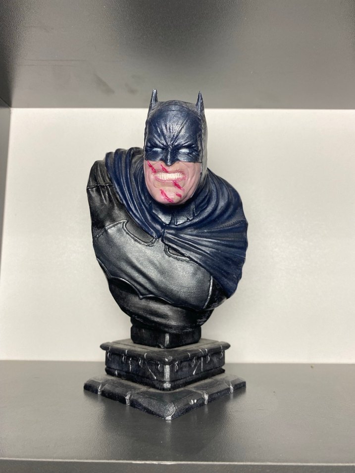 Koyu gri renkte, detaylı işçilikle yapılmış Batman figürü büstü. Karakterin ikonik maskesi ve pelerini gerçekçi bir şekilde yansıtılmış.