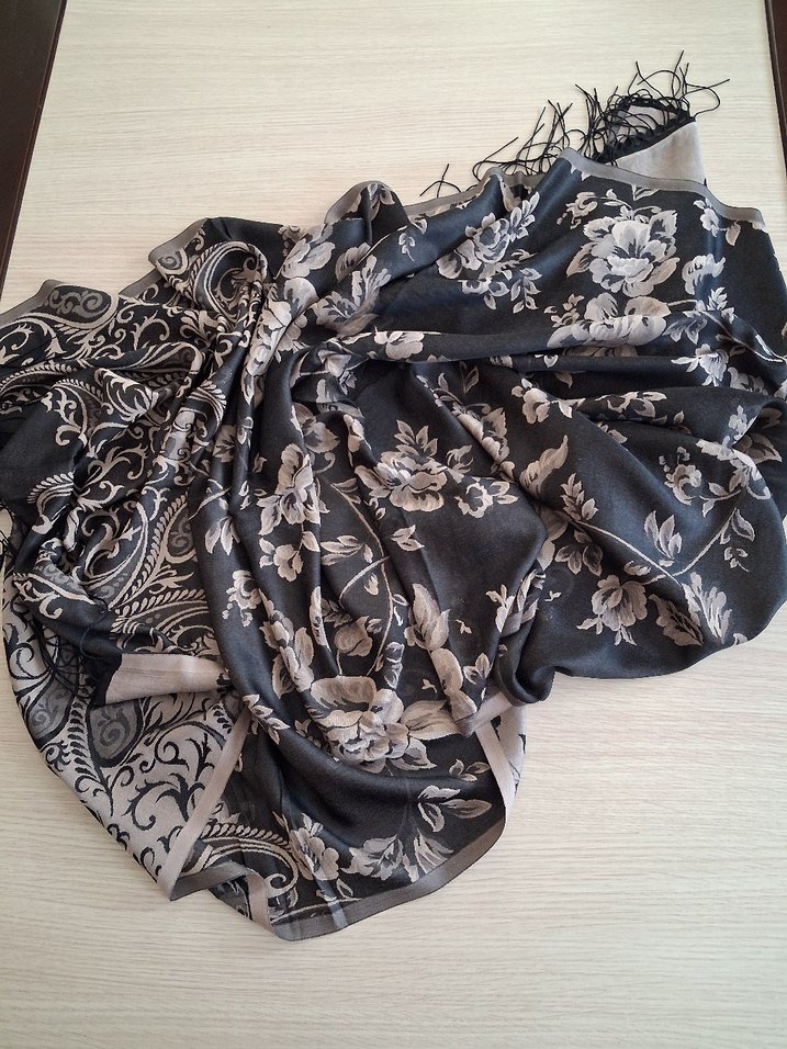 koyu gri çiçek desenli, ipeksi dokulu, drapeli kadın şalı. Bohem ve retro tarzını yansıtır. Hippie stiline uygun.