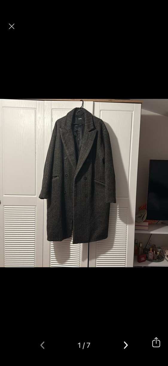 Koyu gri renkte, çift düğmeli ve klasik yakalı kaban. Yan cepleriyle sıcak tutan şık bir dış giyim parçasıdır.