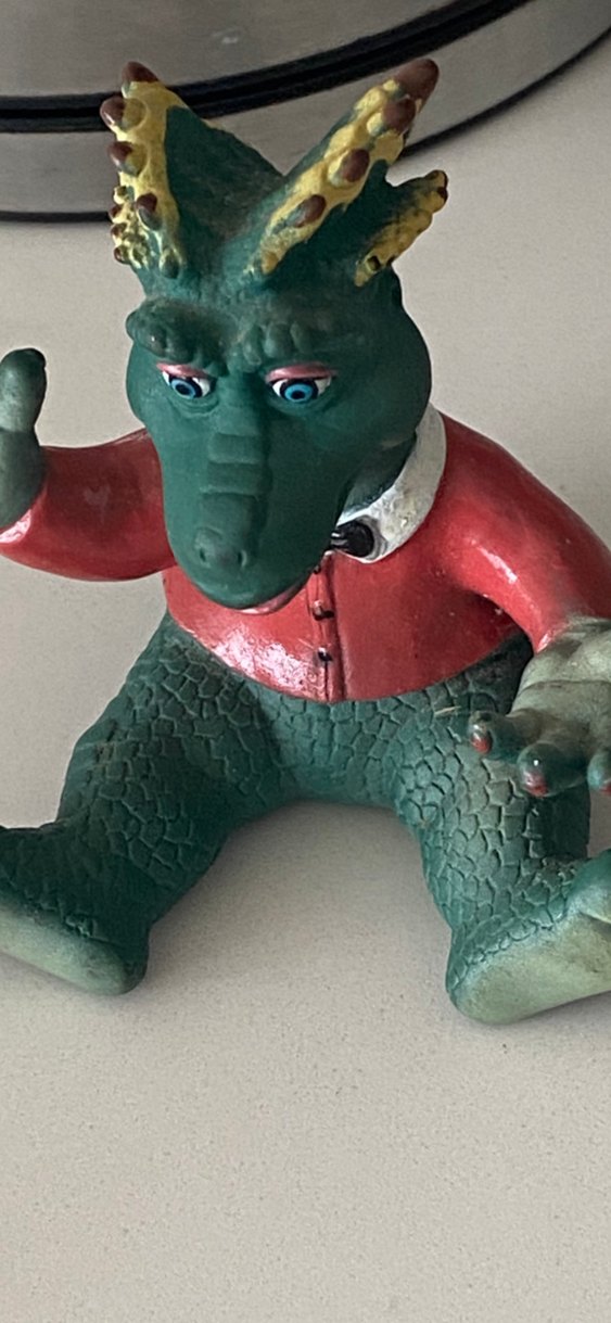 Koyu gri renkli, pul desenli ejderha figürü. Kırmızı gömlek ve beyaz yakalı, detaylı yüz ifadeli ve hareketli pozda.