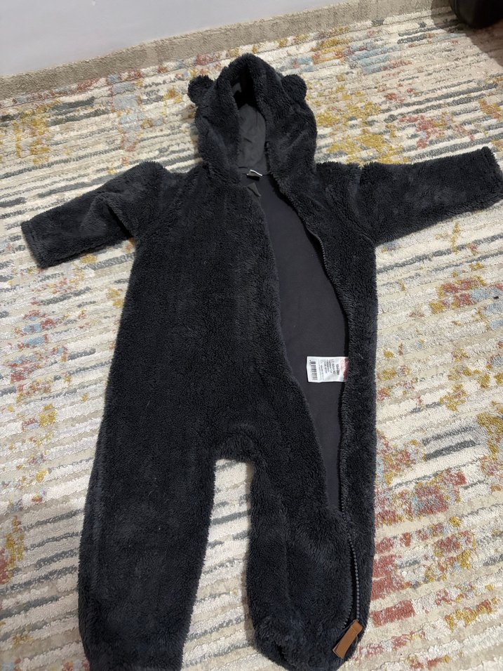 Koyu gri renkli, peluş kumaştan yapılmış erkek bebek tulumu. Kürk detaylı kapüşonu ve ön fermuarı ile sokak tarzına uygun, desensiz tasarım. Görselde de görünüyor tüyleri dökülebiliyor bir kaç yerinde hafif çıkmış