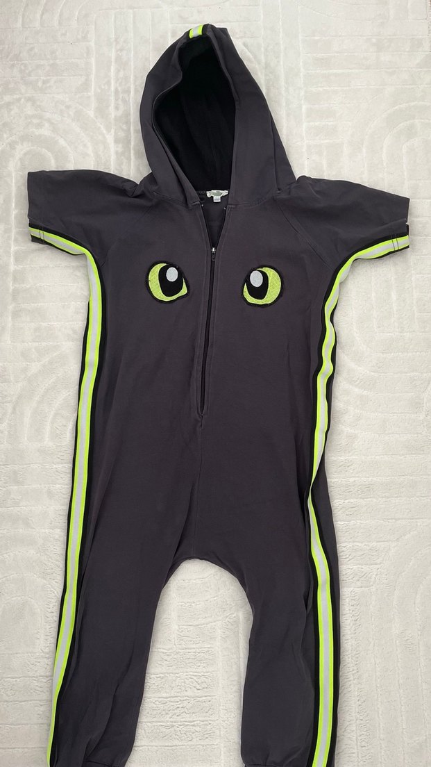 Koyu gri renkte, kısa kollu, önü fermuarlı ve göz desenli bebek tulumu. Yuvarlak yaka ve yumuşak, sıcak kumaşa sahiptir.