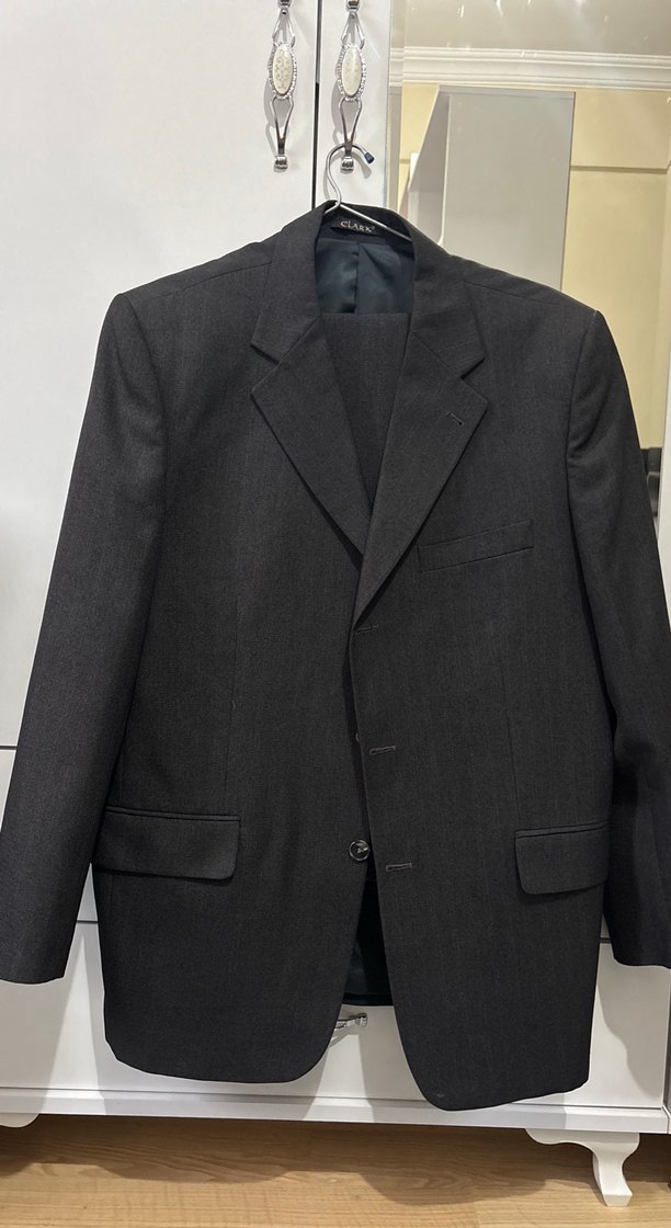 Koyu Gri renkte, düğmeli ve uzun kollu erkek takım elbise ceketi ve pantolonu beraber. Klasık takım 50 beden