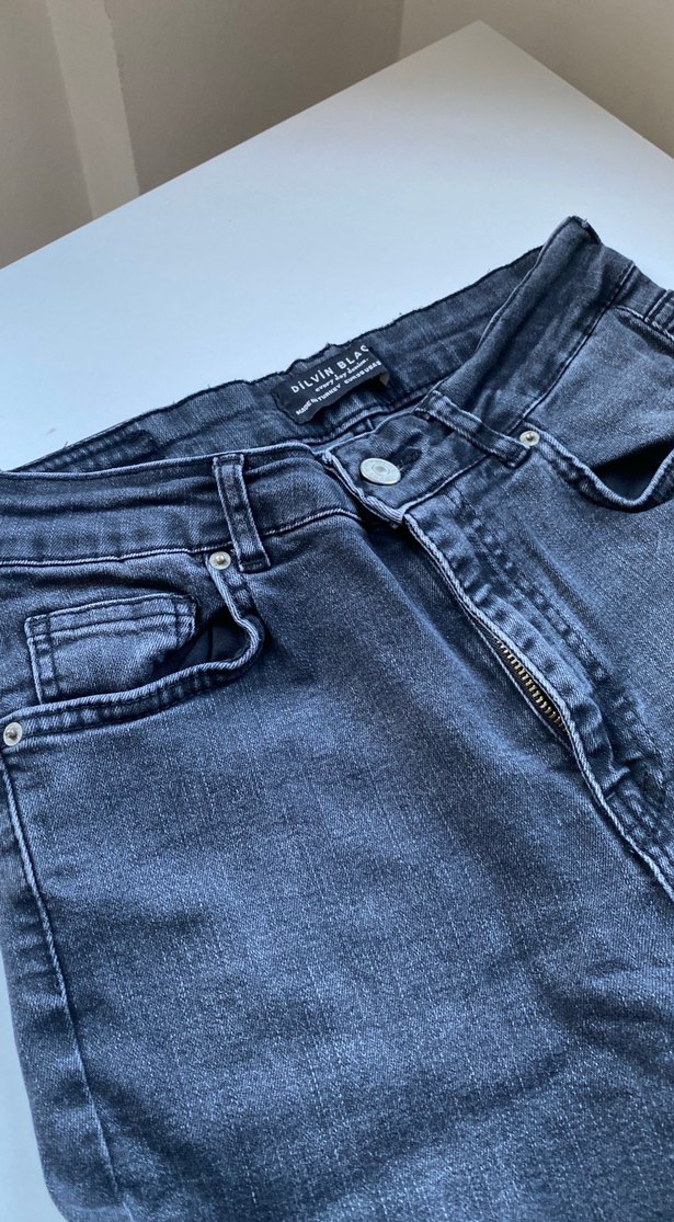 Koyu gri fermuarlı ve dar kesim kadın denim pantolon.desen içermeyen tasarımıyla günlük sokak stili için uygundur.