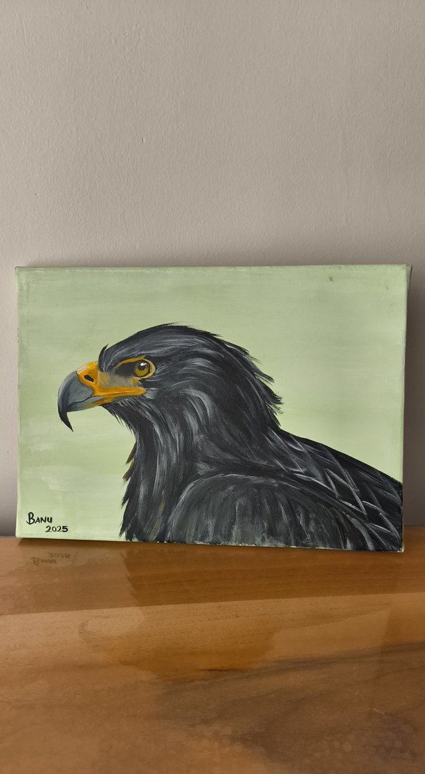 25*35 cm el yapımı Kara Kartal tablo.Açık yeşil zemin üzerinde detaylı tüyleri ve sarı gagası olan koyu gri kartal figürlü tablo.