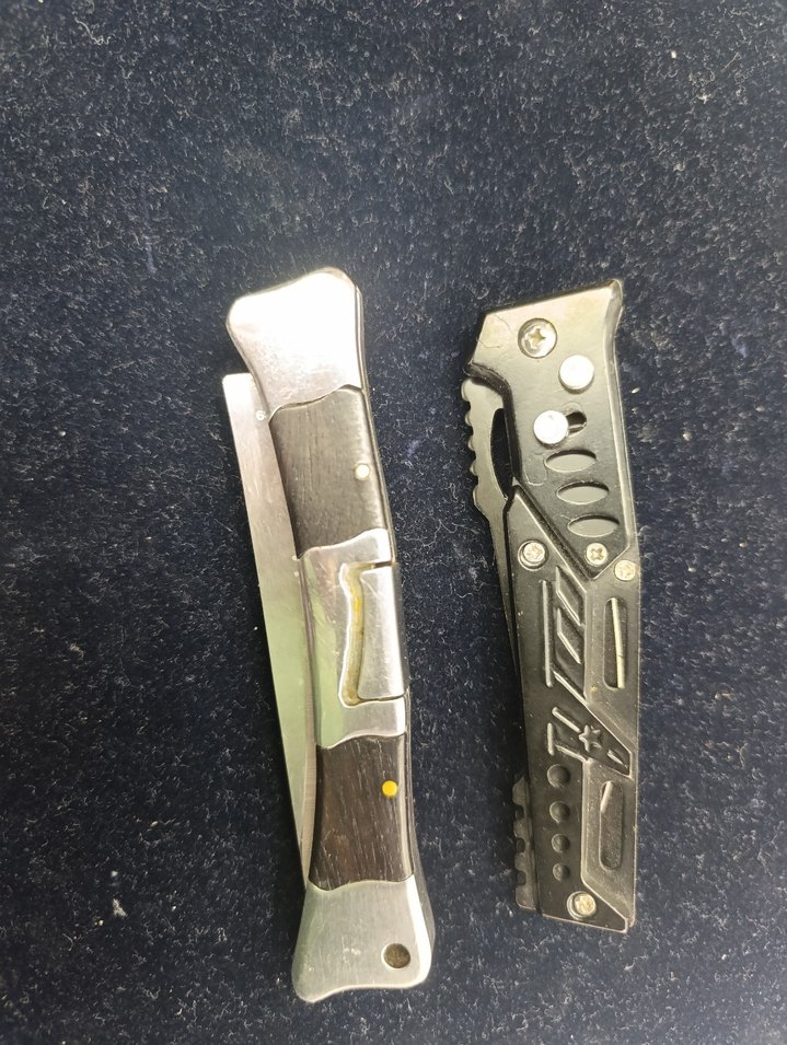 Metal ve dokulu saplara sahip iki koyu gri katlanabilir cep bıçağı seti, kullanışlı tasarıma sahiptir.
