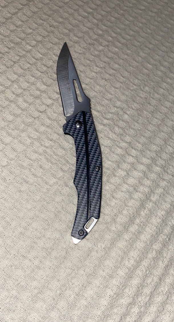 Koyu gri renkli, dokulu saplı ve keskin bıçağa sahip katlanabilir cep bıçağıdır. Karbon desen