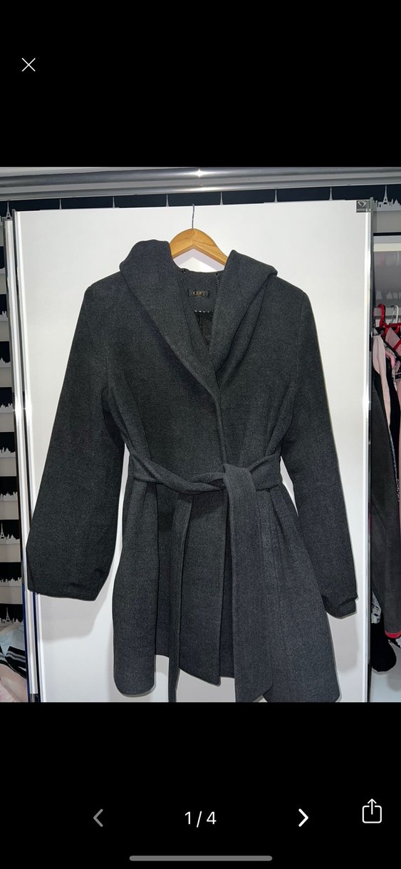 Koyu gri renkte, kemerli ve kapüşonlu kadın kabanı. Uzun kollu ve sade tasarımlı, soğuk havalar için uygun.