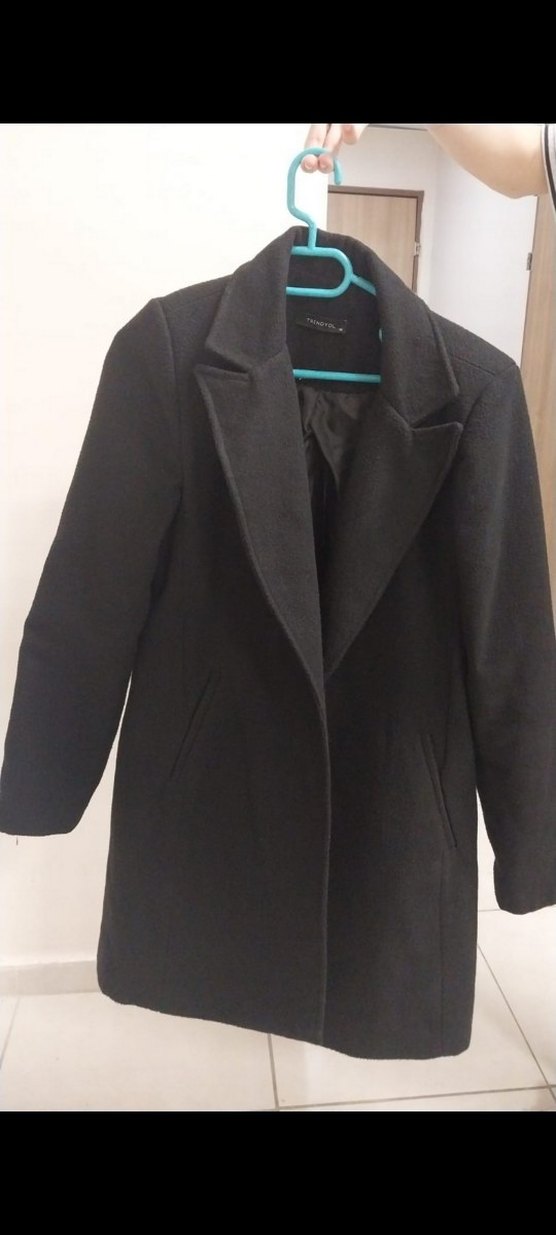 Koyu gri renkte, klasik kesim ve yaka detayı bulunan kadın kabanı. Uzun kollu ve cepli, serin havalar için uygun.