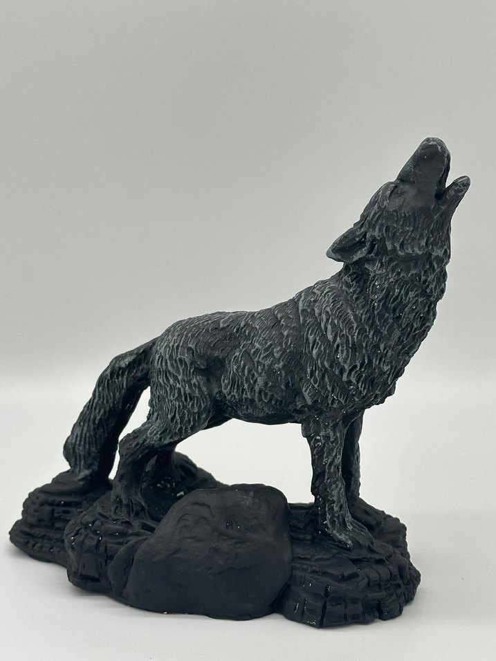 Koyu gri renkte, uluyan pozda detaylı kurt figürü, dokulu bir taban üzerinde duruyor.