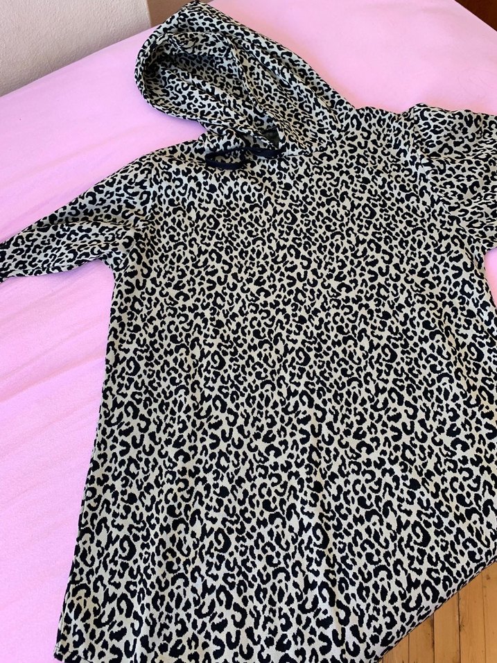 Koyu gri renkli, leopar desenli ve kürklü detaylara sahip kedi kıyafeti, street wear tarzında tasarlanmıştır. L beden