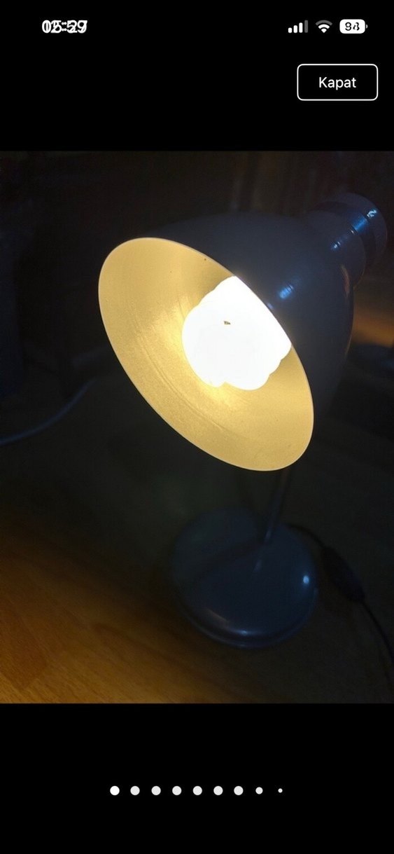 Koçtaş’tan almıştım sağlam çalışıyor kablosunda bazen temassızlık oluyor anahtar aç kapa kısmı açık kalabiliyor bazen. Ampülü içinde olacaktır K renkte masa lambası, geniş başlığıyla ışığı odaklar. Okuma veya çalışma için uygundur. Koyu mavi renkte, yuvarlak başlıklı masa lambasıdır. Işığı belirgin şekilde aşağı yönlendirir.