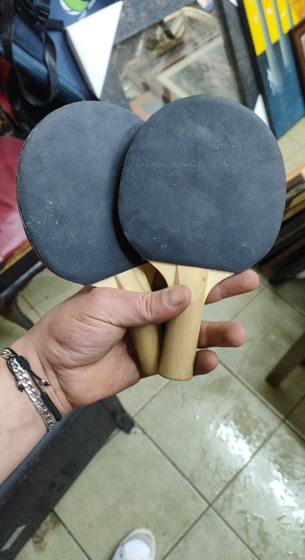Koyu gri yüzeye sahip, ahşap saplı iki masa tenisi raketinden oluşan oyun seti.