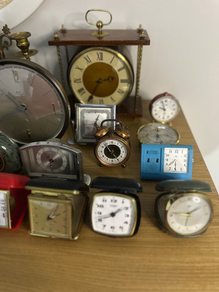 Farklı boyut ve tarzlarda, modern ve vintage tasarımlı koyu gri masa ve duvar saatleri koleksiyonu. ⏰ fiyat temsili