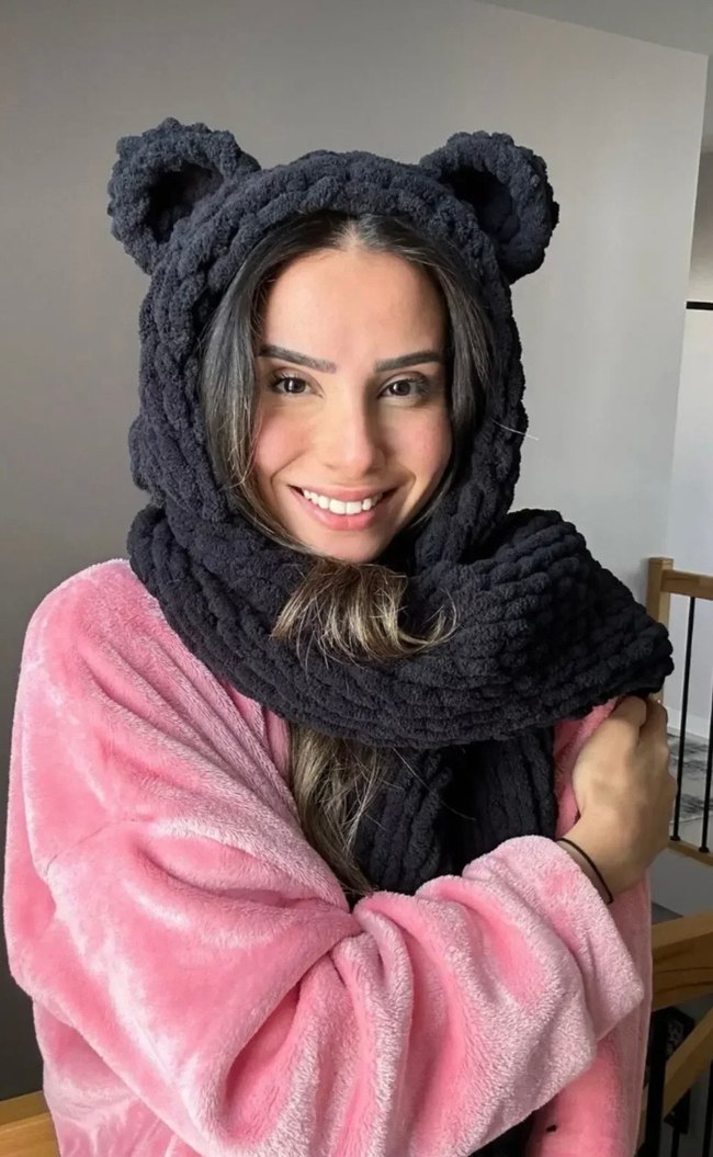 Koyu gri örgü kadın atkı, kapüşonunda ayıcık kulaklarıyla sıcak ve trend goth tarzı sunar. Günlük kullanıma uygundur.