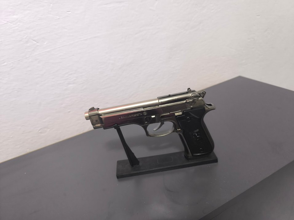 Koyu gri renkte, gerçekçi görünümlü oyuncak tabanca. Dayanıklı malzemeden yapılmış ve sergileme için sağlam bir standa sahip.