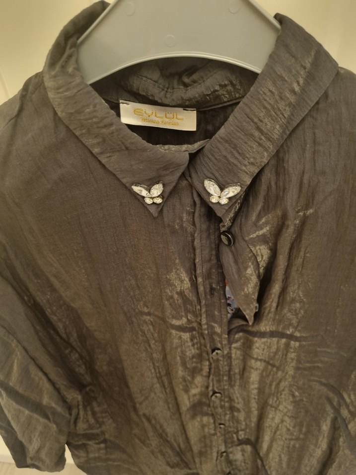 Gri parlak düğmeli, yakalı, uzun kollu gömlek. Salaş kesimi ve günlük kullanıma uygun yapısıyla vintage goth tarzını yansıtır. Yakada kelebek süslemeleri bulunur.