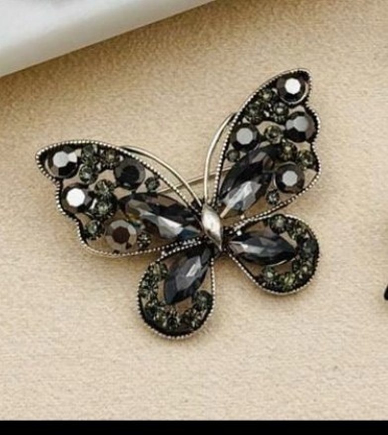 Çok şık, payetli ve nakışlı detaylara sahip koyu gri kelebek broş, vintage goth tarzında.