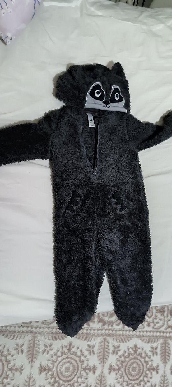Koyu gri peluş kumaştan yapılmış, hayvan yüzü detaylı kapüşonlu bebek tulumu. Ön fermuarlı ve uzun kolludur, sıcak tutar.