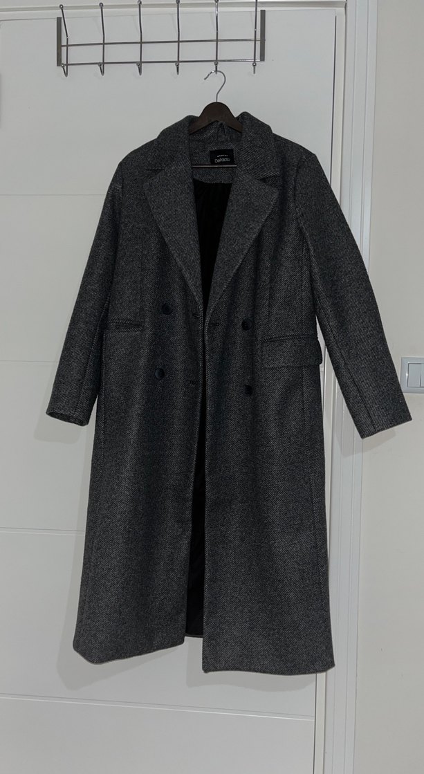 Koyu gri renkte, çift düğmeli uzun kaban. Yan cepleri ve klasik yaka detayı bulunur. Soğuk havalar için uygun, düz kesim.