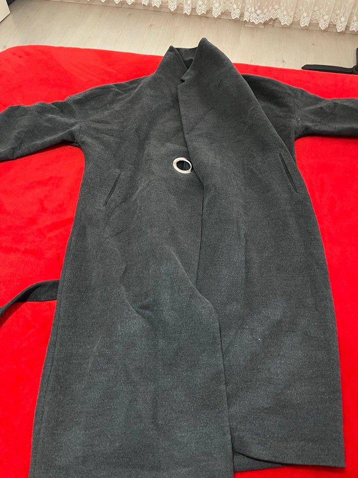 Koyu gri uzun kaban, yüksek yakalı ve tek halkalı kapama detayı ile yan ceplidir. Soğuk havalar için yumuşak ve sıcak kumaştan üretilmiştir.