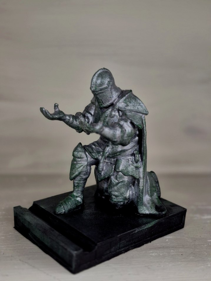 Koyu gri renkte zırhlı bir şövalye figürü, detaylı zırhıyla siyah bir kaide üzerinde diz çökmüş ve elleri ileri doğru açık şekilde tasarlanmıştır. ️ kalem ve telefon tutacağı
