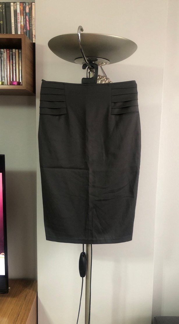 Gri ve beli detaylı, düz midi kalem etek. Düzgün sentetik kumaştan, ofis için şık ve modern bir seçim.