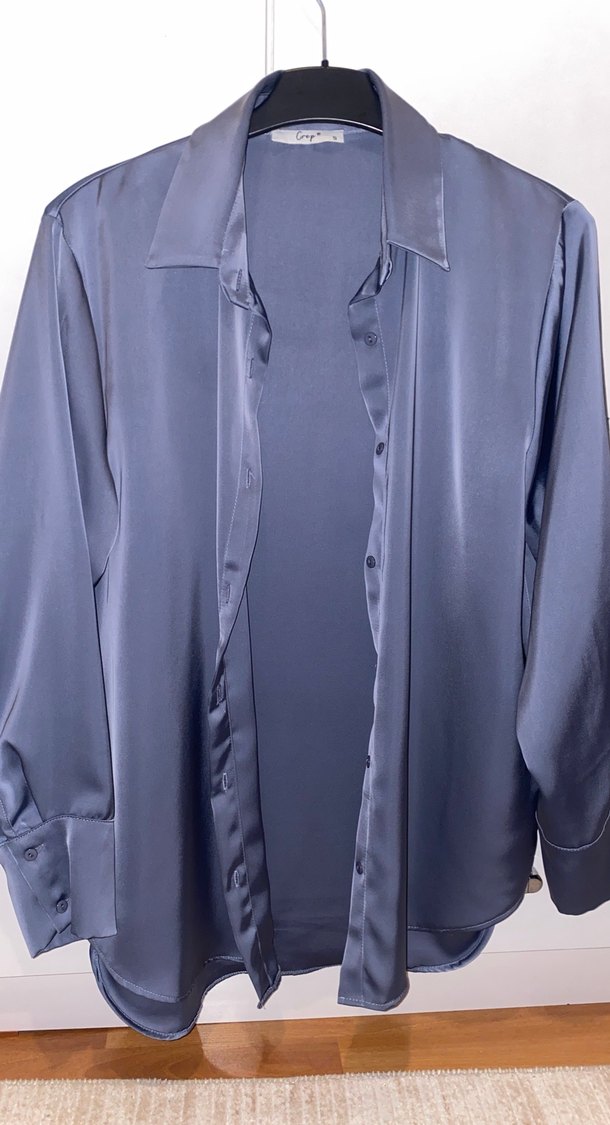 Saten parlak kumaştan, düğmeli ve geniş kesim kadın gömleği. Hemen beden boyu hem de kol boyu uzundur S beden diyor fakat büyük kesim olduğu için M-L çok rahat olur. Bana büyük geldiği için yalnızca bir kez giydim. Ofis için uygun sade ve şık bir model.