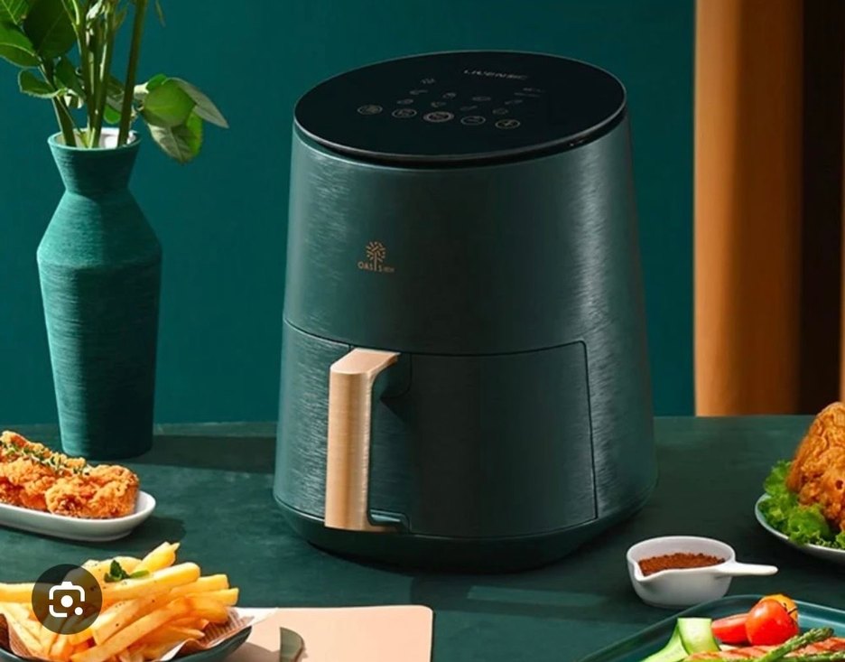 Koyu haki renkte, dokunmatik kontrol paneli ve çıkarılabilir sepetinde ahşap sapı bulunan elektrikli hava fritözü.