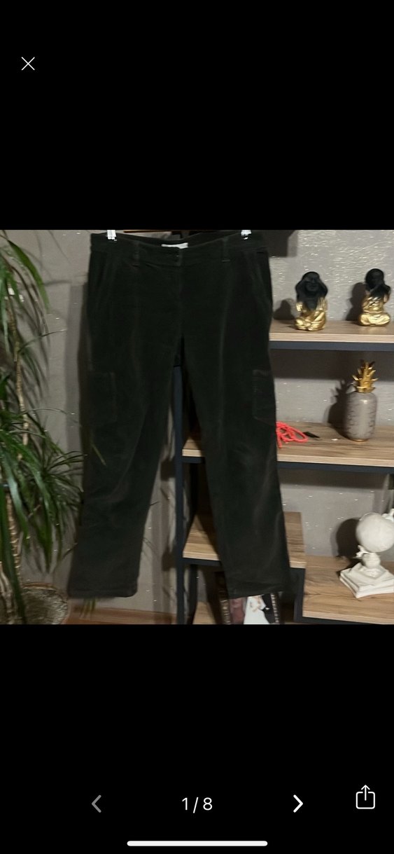 Koyu haki kadife kumaştan, kemerli ve bol kesim kadın pantolonu. Midi boyda, günlük sokak tarzına uygun rahat bir model. Yanlar kargo cep ve extrafor şerit var. Arkada iki adet kapaklı cep mevcut. Bel tam düşük değil normal bel.Sayılı kullandım çok temiz yeni bir ürün.QC İtalyan markasıdır.