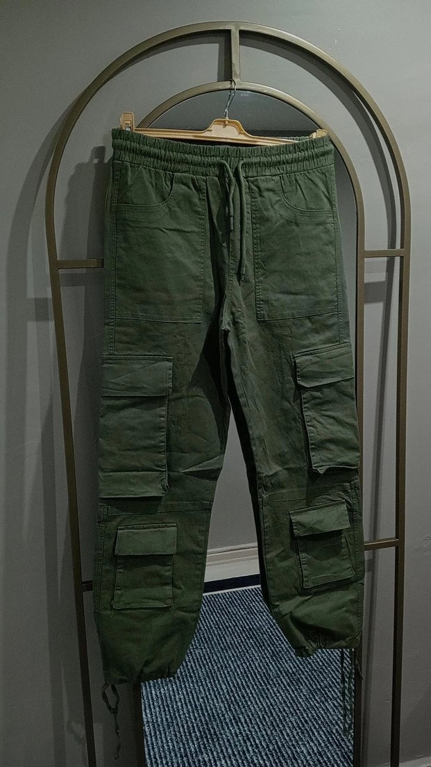 kamuflaj pantolon. Koyu paçası bağlamalı haki sade keten kumaştan, dış mekan kullanımı için uygun. BEDENLER S/M/L