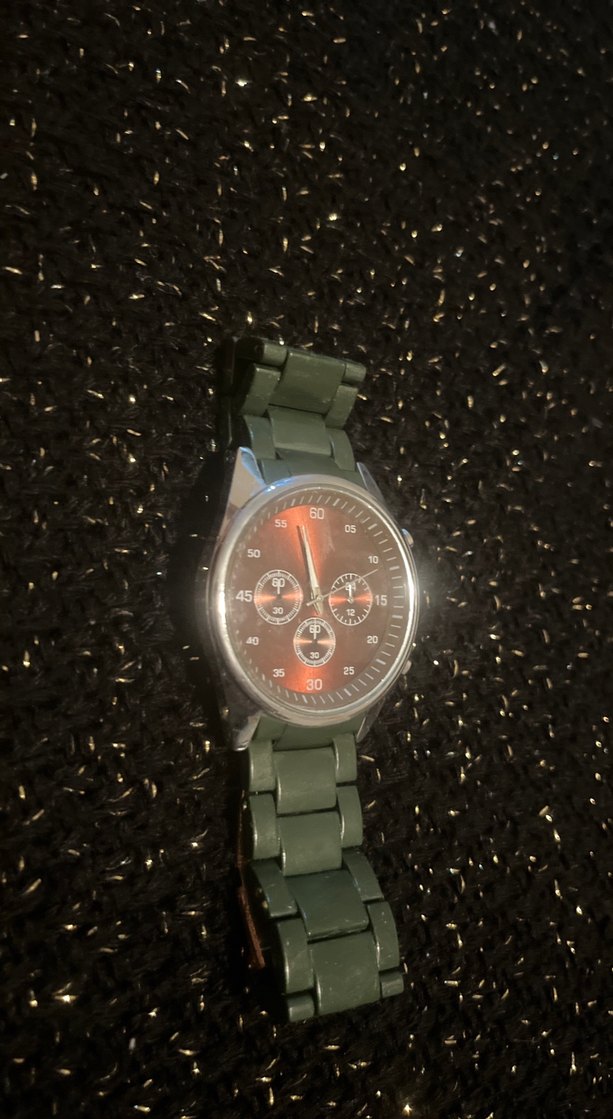 Koyu haki metal kordonlu, çoklu alt kadranlara sahip yuvarlak kadranlı erkek kol saati. ⌚