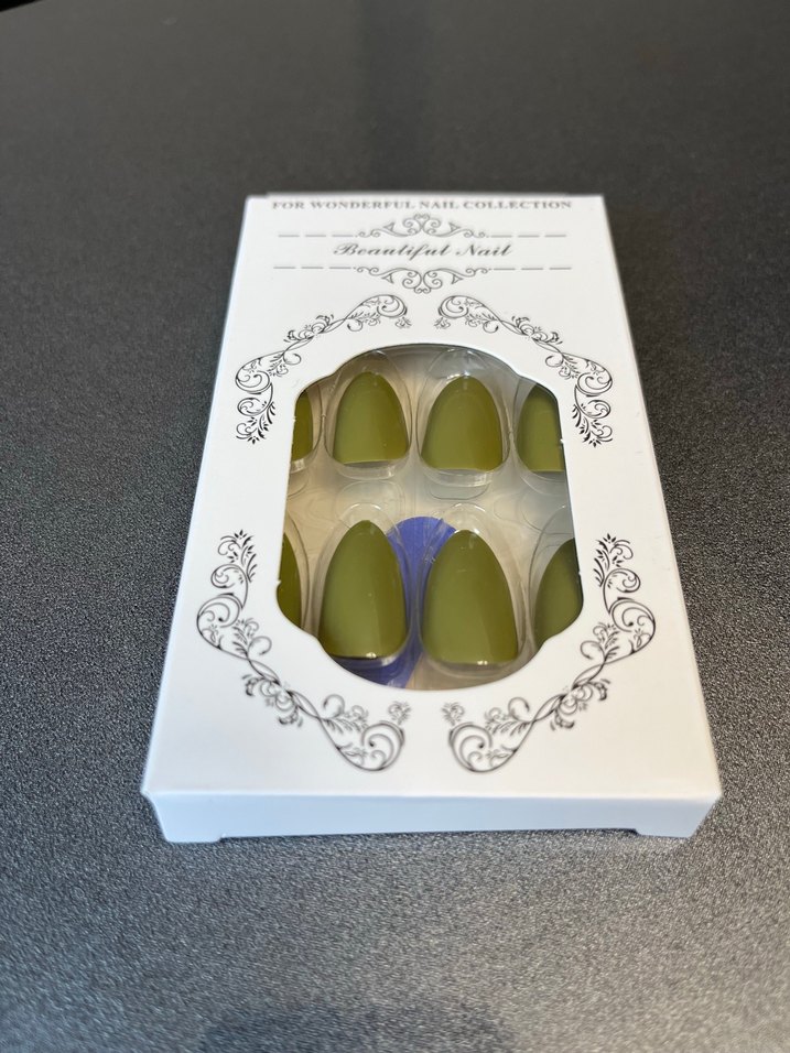 Koyu haki renkte, düzgün yüzeyli ve şık şekilli yapay tırnak seti. 24 adet tırnak 24 adet yapıştırıcı bir adet törpü