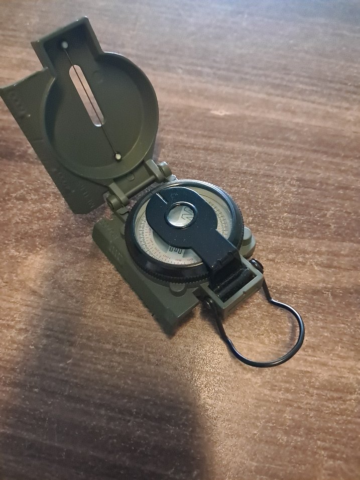 Koyu haki renkli askeri tarzda pusula, hassas yön bulma için kapaklı ve nişangah açıklıklı.