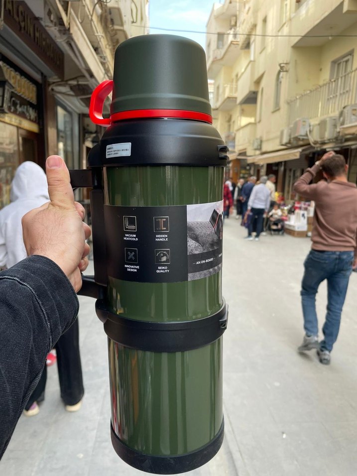 Koyu haki renkte, sağlam yapılı çocuk termosu. Kolay taşınması için kulplu ve sızdırmaz kapaklıdır. İçecekleri uzun süre sıcak veya soğuk tutar.