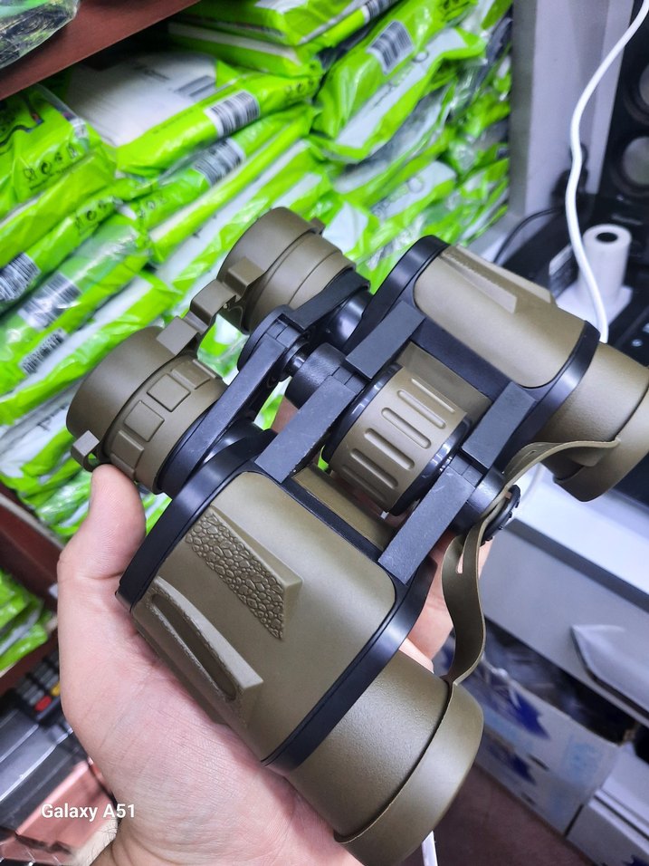Ayarlanabilir odaklama ve dokulu tutma yüzeyiyle koyu haki renkli sağlam dürbün. Dış mekan kullanımı için uygun.